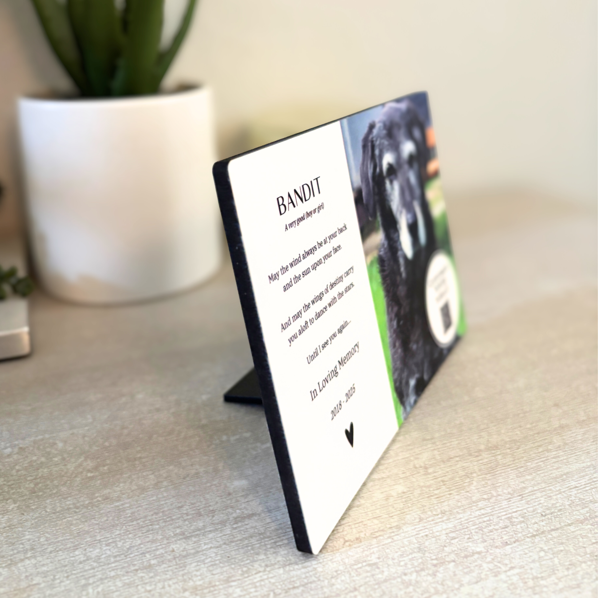 Honor the beautiful memories of your beloved companion with our custom pet memorial panel. This heartfelt keepsake is a timeless way to celebrate the love, loyalty, and joy your furry friend brought into your life.