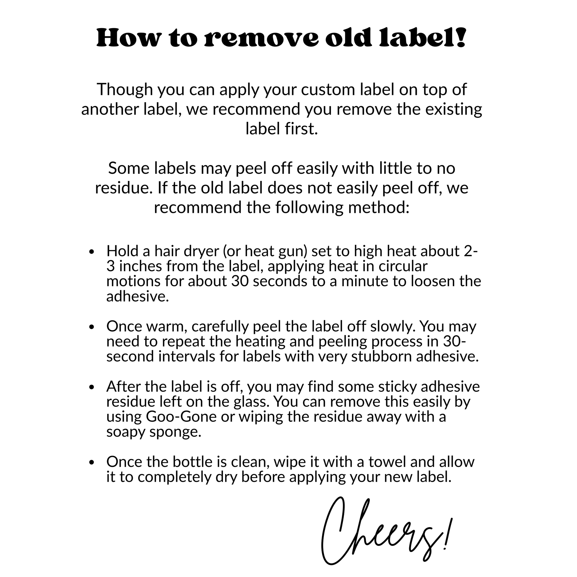 Some labels may peel off easily with little to no residue. If the old label does not easily peel off, we recommend the following method: